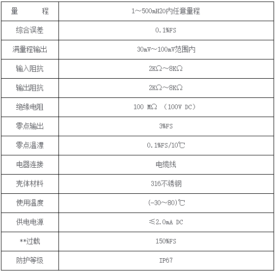 YB4液位传感器精度高,输出信号稳定,防油、防水,广泛应用于煤矿水汶监测,污水、河水、江水的处理及水渠、江河、深井、湖泊、海岸、地质等水汶检测。一、产品特点1、精度高,输出信号稳定;2、 内部采用密封胶防护,防油、防水;3、采用上等不锈钢外壳,外观精美,耐腐蚀性强;二、外形尺寸(可根据用户实际要求订做)三、技术参数四、主要用途广泛应用于煤矿水汶监测,污水、河水、江水的处理及水渠、江河、深井、湖泊、