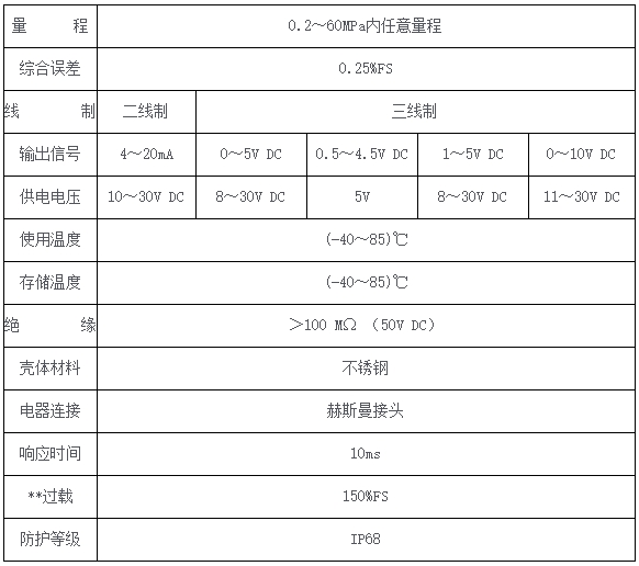 压力变送器采用316不锈钢弹性体原件,高精度应变计及先进的生产和技术工艺。具有灵敏度高、性能稳定、良好的抗冲击能力,安装方便的特点。专业应用于气体、液体压力检测,如水、油、轻度腐蚀性液体和气体,在许多过程软弱的腐蚀性介质中的压力测量与控制。一、产品特点1、采用进口芯片,精度高、稳定性好;2、传感器部分采用不锈钢外壳,具有一定抗腐蚀性、外观精美。3、标准电压/电流输出,互换性强;4、超强的抗干扰设计