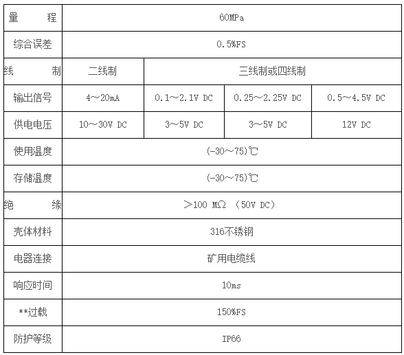 YB30压力变送器采用316不锈钢弹性体原件,高精度应变计及先进的生产和技术工艺。具有灵敏度高、性能稳定、良好的抗冲击能力,安装方便的特点。专为矿井围岩应力监测设计,在许多过程软弱的腐蚀性介质中的压力测量与控制。广泛应用于煤矿**监测、石油化工、工业测量系统、机械制造、汽车制造、环保、水利,公路桥梁等行业。一、产品特点1、采用进口芯片,精度高、稳定性好;2、内部采用德国进口密封胶防护,防油、防水;